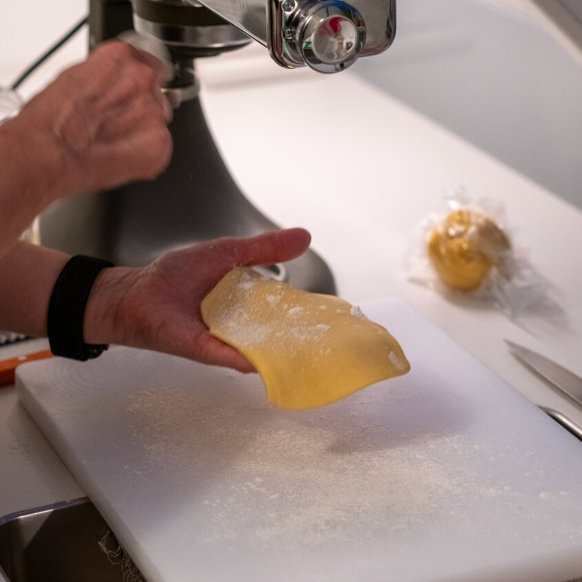85g Hartweizengries, 30g Mehl, 1 Ei, 1/2 EL Olivenöl, 1 bis 2 EL Wasser miteinander verkneten, dann für mindestens 1 Stunde luftarm und -dicht, in Plastikfolie, im Kühlschrank ruhen lassen.