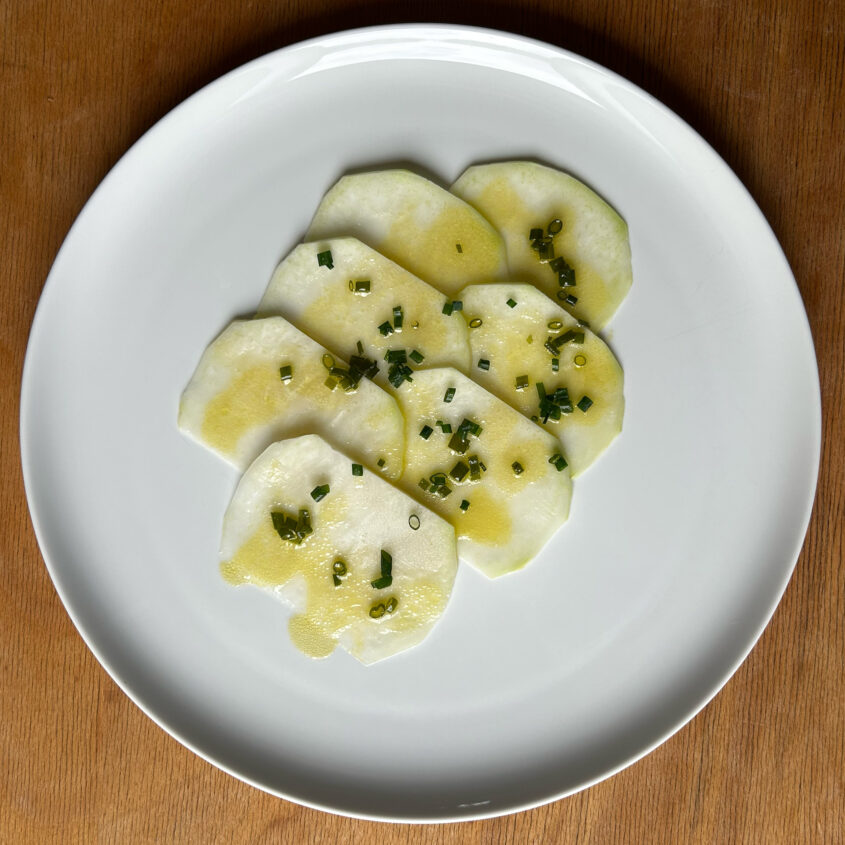 1 möglichst jungen, zarten Kohlrabi schälen und mit dem Küchenhobel in gleichmäßige, hauchdünne Scheiben schneiden und die Scheiben auf Tellern auslegen. Eine Vinaigrette aus 3 EL weißem Balsamico, 1 TL Senf, 1 EL Wasser, 1 EL Agavendicksaft, 2 EL gehacktem Schnittlauch und 2 EL Olivenöl herstellen und über den Kohlrabi geben, für 15-20 Minuten marinieren lassen.