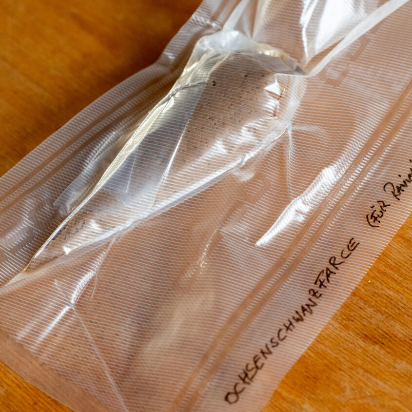 Das Fleisch von den Ochsenschwanzstücken lösen und in einem kleinen Topf sammeln. In einer kleinen Pfanne 1EL Butter schmelzen und darin die fein gehackte Zwiebel und den Knoblauch anschwitzen, die Pilzscheiben ebenfalls. Mit dem Pürierstab eine Farce herstellen (wenn die Farce zu dünn erscheint, etwas vom Gemüse hinzugeben, wenn sie zu dick ist, etwas von der Sauce hinzufügen). Die Farce, je nach Geschmack, mit Salz, Pfeffer, Sojasauce, Miso, gereiftem Sellerie, … abschmecken und dann auf 2 Spritzbeutel verteilen. Aus unseren 4 Stück Ochsenschwanz wurde so viel Farce, dass es für mindestens 2 Mal Ravioli reicht. Einen der Spritzbeutel vakuumieren und einfrieren.