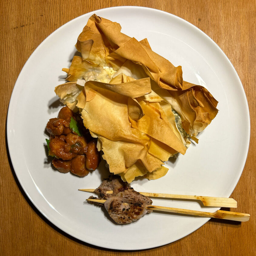 Die Kräuter, den Spinat mit Zwiebeln und Knoblauch, den Feta, die Zitronenzesten und den Saft in eine große Schüssel geben, ~150g griechischen Joghurt (eine Mischung aus Joghurt und Creme Fraiche geht auch …) mit 2 ganzen Eiern vermischen und auch in die Schüssel geben. Alles gut vermengen und die Masse mit Salz, Pfeffer, frisch geriebener Muskatnuss abschmecken.